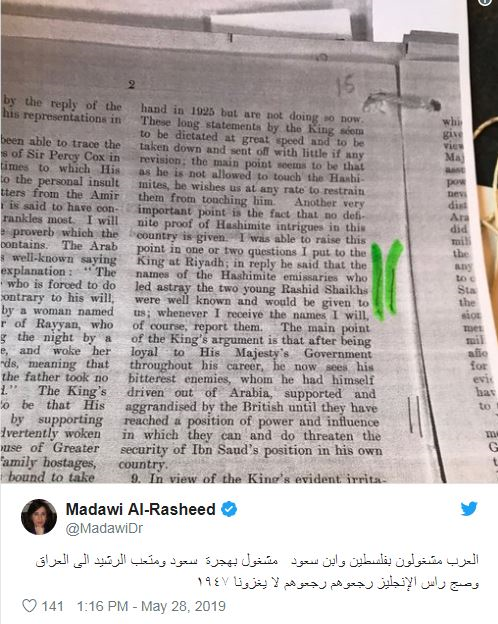 وأكدت الرشيد، وهي باحثة وأكاديمية سعودية في مركز الشرق الأوسط بالمملكة المتحدة، “أن همّ ابن سعود أيام النكبة كان في الحفاظ على عرشه من مخاطر كانت تأتيه من العراق والأردن”.