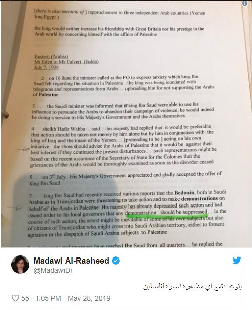وأضافت: “هذه هي الرواية السعودية الرسمية، التي تريد أن تظهر كما لو أن السعودية لم تتخل عن فلسطين، وهذه رواية غير دقيقة من خلال البحث العلمي الذي أجريته”.