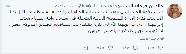 وصف الأمير السعودي خالد بن فرحان آل سعود، الملك سلمان بن عبد العزيز بـ خائن الحرمين على خلفية القمم التي استضافتها السعودية، مؤكدا أن “هزيمته وزلزلته” باتت قريبة، فيما أشار إلى “فشل” ما وصفها بـ”قمم الخزي” في بيع القضية الفلسطينية.