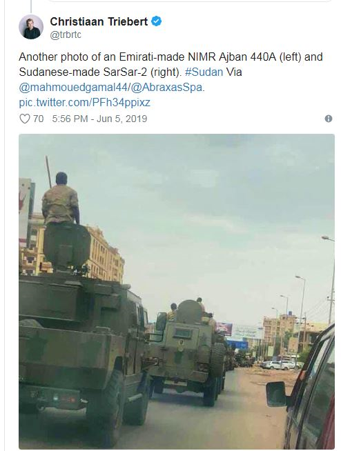 ونشر تريبرت، المتخصص في إعداد التحقيقات حول الشرق الأوسط وتغطية الحروب، سلسلة تغريدات على حسابه في موقع تويتر، أكد فيها وجود مدرعات إماراتية من طراز “نمر عجبان 440A” في شوارع الخرطوم، مرفقا ذلك بمجموعة من الصور ومقاطع الفيديو.
