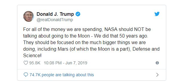 وكتب الرئيس على تويتر: “يجب أن لا تتحدث ناسا عن الذهاب إلى القمر – لقد فعلنا ذلك قبل 50 عاما.. يجب أن تركز على الأشياء الأكبر بكثير التي نقوم بها بما في ذلك الذهاب إلى المريخ!”.
