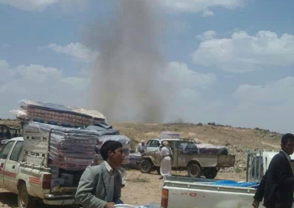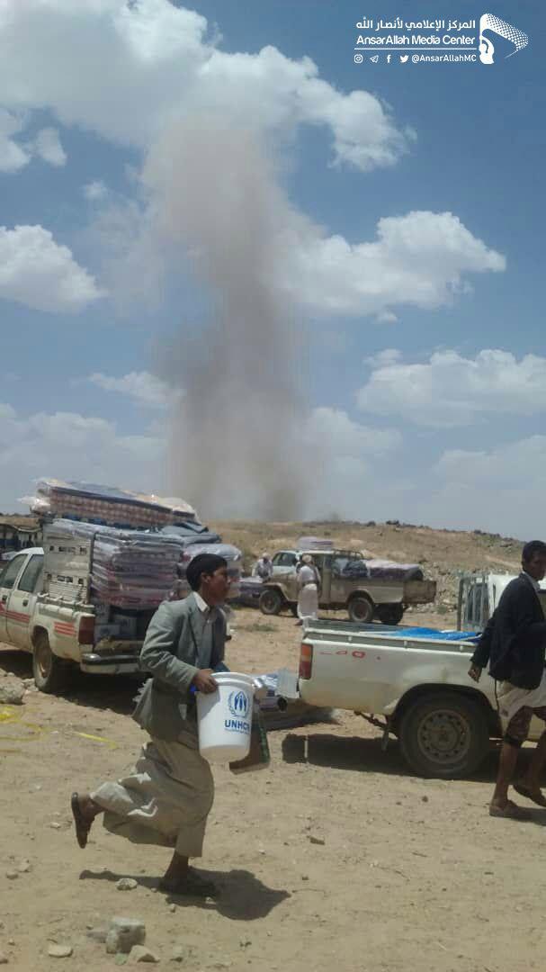 وأظهرت صورٌ للمركز الإعلامي لأنصار الله، لحظةَ قيام طائرات التحالف ، باستهداف موقع صرف المعونات والمساعدات.