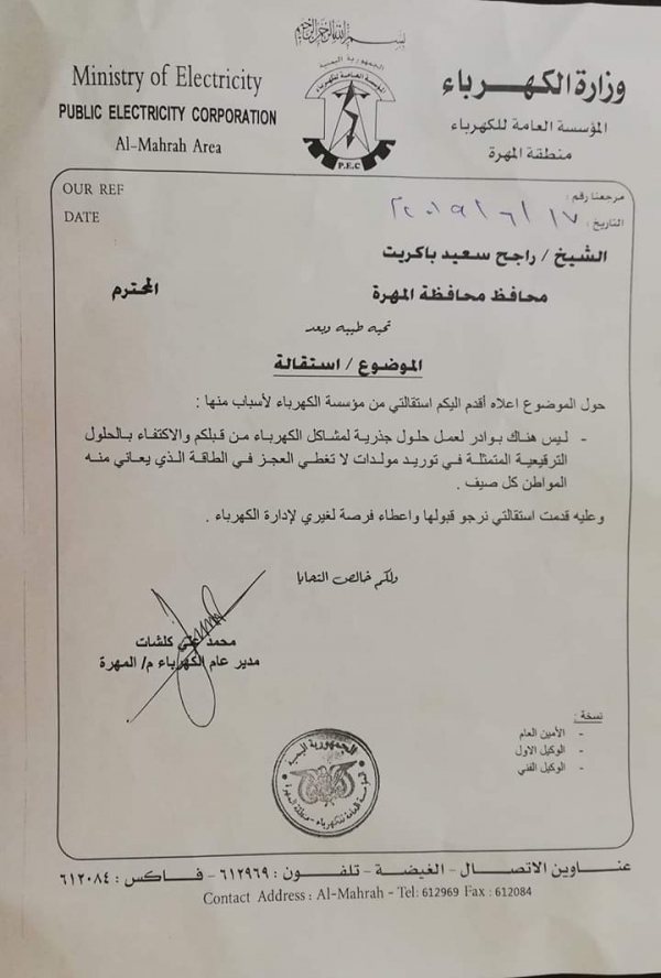 فساد “الشرعية” يدفع مدير عام كهرباء المهرة لتقديم استقالته .. (وثيقة)