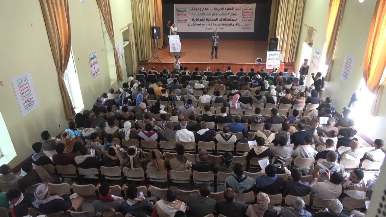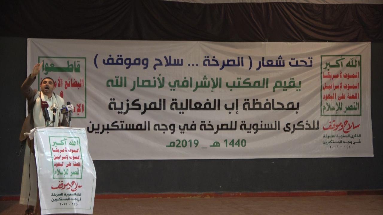 وحسب موقع “المسيرة نت” التابع للحوثيين، حضر الفعالية التي نظمها المكتب الإشرافي لأنصار الله (الحوثيين) بإب وكيل المحافظة راكان النقيب ألقى نائب المشرف العام وكيل المحافظة عبدالفتاح غلاب كلمة بين فيها الدور الذي لعبته هذه الصرخة في التأثير النفسي على أعداء الأمة من اليهود والأمريكان الذين جعلوا من الإسلام هدفا لمؤامراتهم ومخططاتهم الخبيثة . مشيرا إلى أن هذا التكالب وهذا العدوان الغاشم على هذا البلد خوفا من هذا المشروع القرآني الذي جعل هذه الصرخة شعارا له.