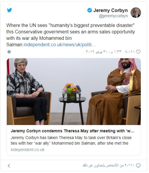 وقال كوربين في تغريدة على حسابه على موقع التواصل الاجتماعي “تويتر”: حيث ترى الأمم المتحدة “أكبر كارثة يمكن الوقاية منها”، ترى هذه الحكومة المحافظة فرصة لبيع الأسلحة مع حليفها في الحرب محمد بن سلمان”.