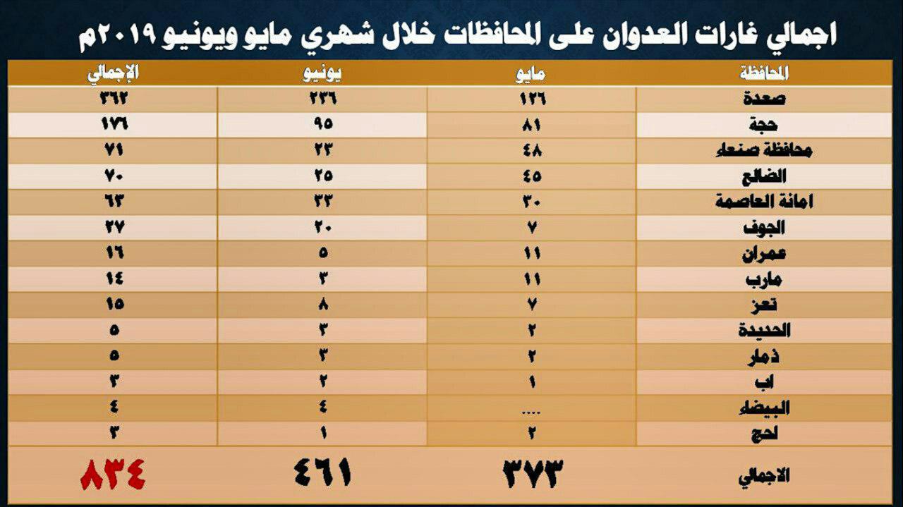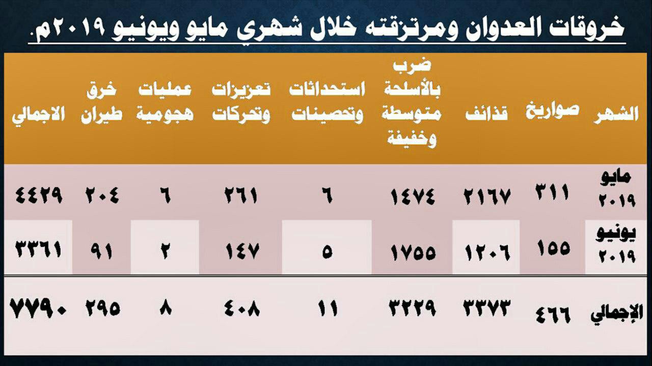 وقال متحدث قوات الحوثيين، في مؤتمر صحفي بالعاصمة صنعاء الثلاثاء، أن التحالف والقوات الموالية له ارتكبوا خلال مايو ويونيو، 7790 خرقا، منها 4429 خرقا خلال شهر مايو و3361 خرقا خلال شهر يونيو، مشيرا إلى أن اجمالي الخروقات في الحديدة منذ إتفاق وقف إطلاق النار في 18 ديسمبر 2018م بلغت 27714 خرقاً.