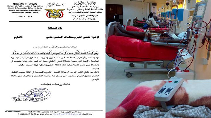 وجه مركز الغسيل الكلوي بمديرية زبيد محافظة الحديدة نداء استغاثة لفاعلي الخير والمنظمات والجمعيات الخيرية العاملة في المحافظة لإنقاذ المركز من التوقف.