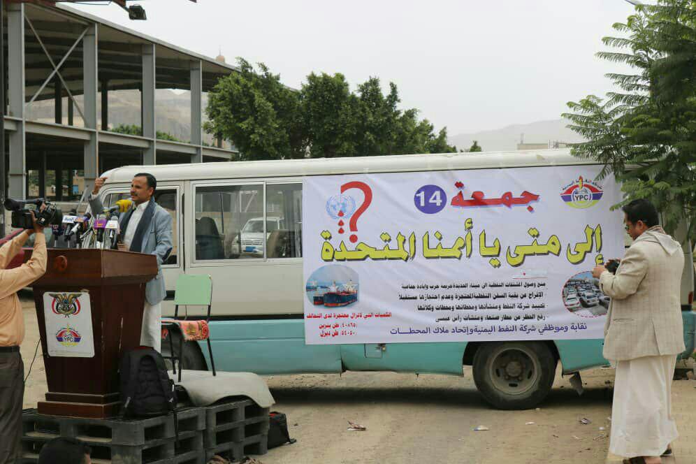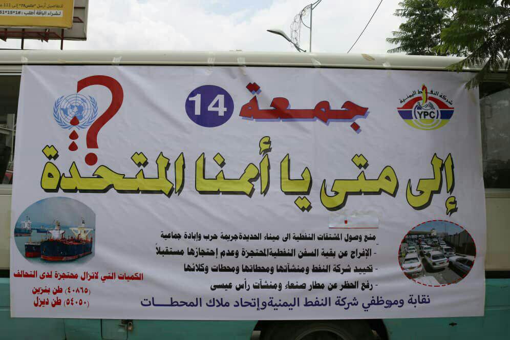 جدد موظفو شركة النفط اليمنية والنقابات والهيئات التابعة لها، الذين يعتصمون للجمعة الـ14 على التوالي أمام مكتب الأمم المتحدة بصنعاء مطالبتهم للأمم المتحدة بإطلاق كافة سفن المشتقات النفطية التي يحتجزها التحالف السعودي الإماراتي واللجنة الإقتصادية التابعة لحكومة “الشرعية” في عدن.