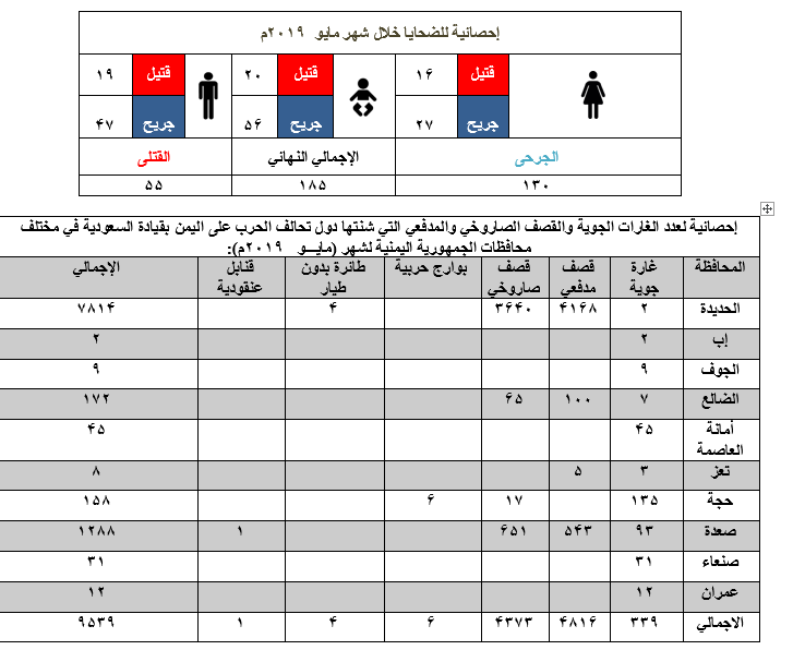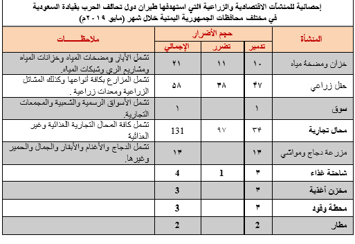 – استمرار استهداف وإغلاق المطارات والموانئ اليمنية من قبل تحالف الحرب على اليمن بقيادة السعودية أدى إلى خسائر اقتصادية كبيرة ، حيث بلغت الخسائر التقديرية على قطاع الطيران المدني والأرصاد بحوالي مبلغ ثلاث مليار دولار .