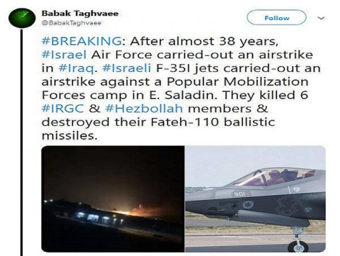 وقال تغافي في تغريدة على “تويتر” باللغة الانكليزية إن “طائرات اسرائيلية من طراز أف 35 نفذت غارة على معسكر للحشد الشعبي في محافظة صلاح الدين”.