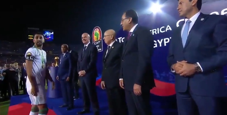 ويُظهر فيديو نجم المنتخب الجزائري ونادي مانشستر سيتي الإنجليزي، وهو يصعد منصة التتويج، حيث صافح السويسري جياني إنفانتينو، رئيس الاتحاد الدولي لكرة القدم، ثم صافح الرئيس الجزائري المؤقت عبدالقادر بن صالح.