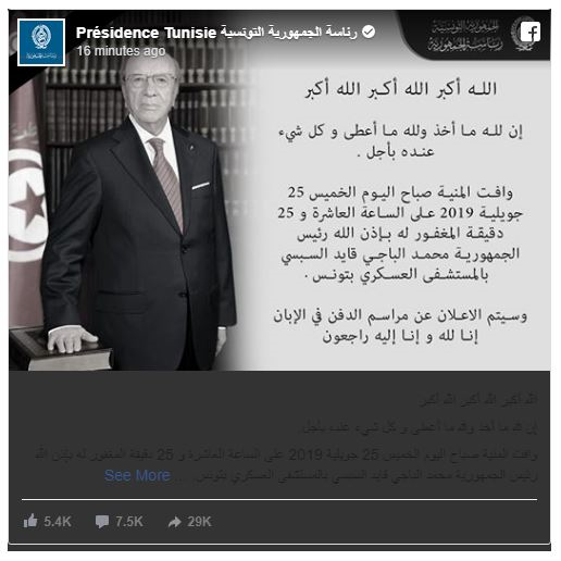 ونعت صفحة رئاسة الجمهورية التونسية، على موقع التواصل الاجتماعي فيسبوك الرئيس محمد الباجي قايد السبسي، الذي وافته المنية في الساعة العاشرة من صباح اليوم، مؤكدة أنه سيتم الإعلان عن مراسم الدفن لاحقا.