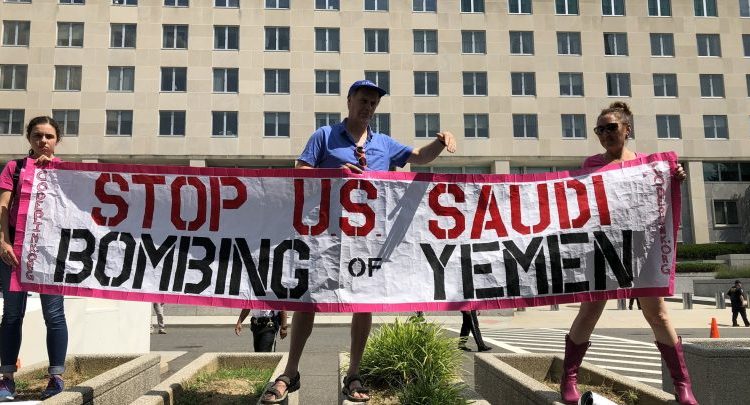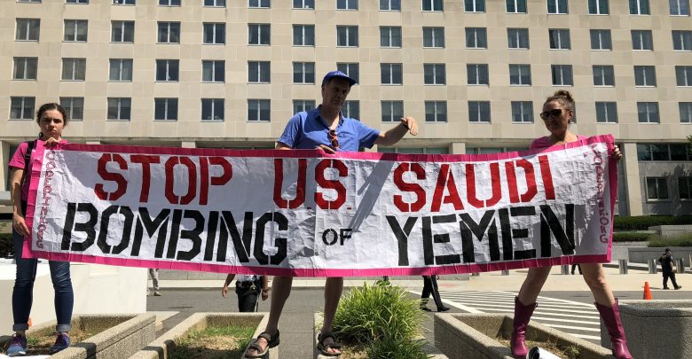 نظم ناشطو حركة كود بينك الأمريكية وقفتان احتجاجيتان أمام السفارة السعودية ووزارة الخارجية الأمريكية في واشنطن للتنديد بجرائم التحالف السعودي في اليمن.