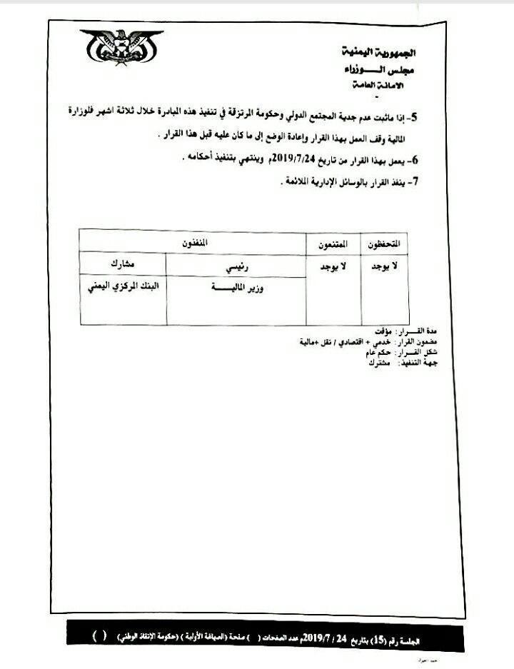 وجاء في القرار، بعد إطلاع مجلس الوزراء على مبادرة المجلس السياسي الأعلى الصادر بتاريخ 1/7/2019م، والتي وجهت الحكومة بفتح حساب خاص تورد إليه إيرادات الموانئ الثلاثة (الحديدة- رأس عيسى- الصليف) ويخصص لصرف مرتبات كافة موظفي الدولة.
