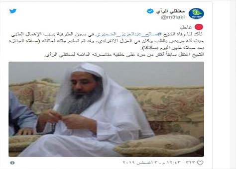 وكان الداعية أحمد العماري، توفي مطلع العام الجاري داخل السجن، وذلك بعد شهور من حديث شبه مؤكد عن قتل الداعية سليمان الدويش، المعتقل منذ سنوات.