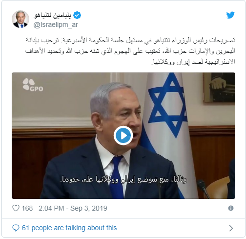 ودعا “الدول الأخرى” للوقوف ضد عدوانية إيران وتوابعها، حسب تعبيره. ووجه نتنياهو شكرا خاصا للرئيس الأميركي دونالد ترامب ووزير خارجيته مايك بومبيو على قرارهما إخراج البنك الذي يزود حزب الله بالمال وإدخاله في قائمة العقوبات.