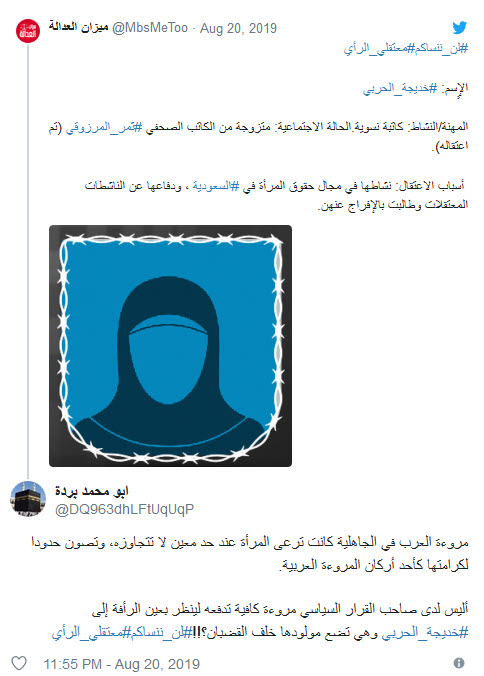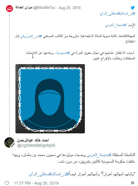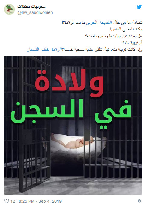 حساب يحمل اسم “سعوديات معتقلات”، تضامن مع حالة خديجة الحربي، وكتب: “نتساءل ما هي حال خديجة الحربي ما بعد الولادة؟!