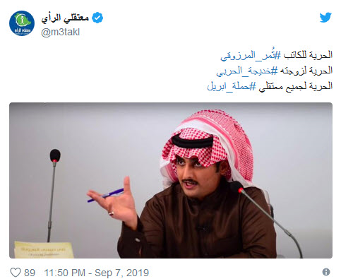 أحمد خالد عبد الرحمن شارك في هاشتاج “خديجة الحربي”، وكتب معلقا: “الناشطة المعتقلة خديجة الحربي وضعت مولودها في سجون محمد بن سلمان؛ وبهذا عاقبت حكومة السعودية كائنين بشريين؛ من دون ذنب.