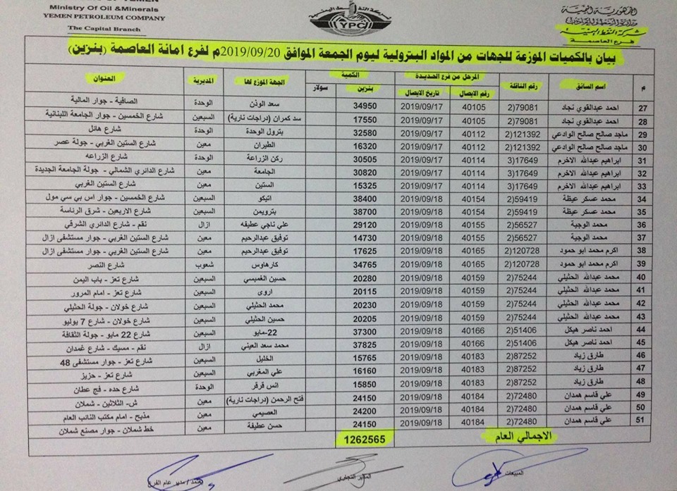 نشرت شركة النفط اليمنية في صنعاء، كشوفات بأسماء المحظات التي سيتم تزويدها بمادة البنزين في عموم مديريات أمانة العاصمة، لليوم الجمعة 20 سبتمبر.