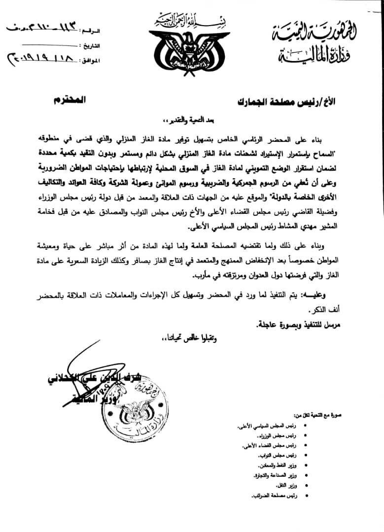 وجهت وزارة المالية التابعة لحكومة الحوثيين في صنعاء، مصلحة الجمارك، بتسهيل جميع كل الإجراءات والمعاملات الخاصة بتسهيل عملية إستيراد مادة الغاز المنزلي، وإعفاء الكميات المستوردة من الرسوم الجمركية.
