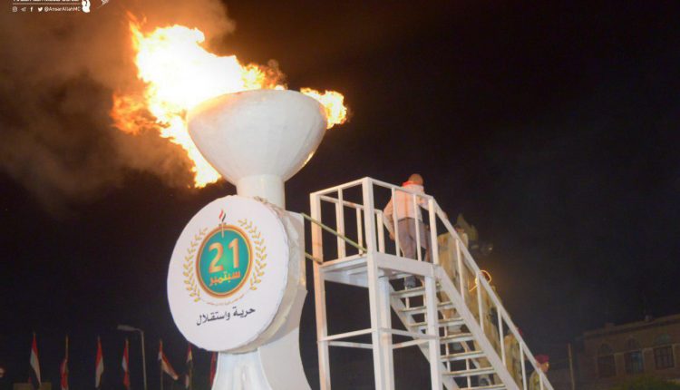 أقيم بميدان التحرير بالعاصمة اليمنية صنعاء، مساء الجمعة، حفل إيقاد شعلة ما يطلق عليها الحوثيون وحلفاؤهم بــ”الذكرى الخامسة لثورة الـ21 من سبتمبر”.
