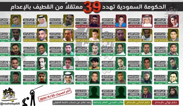 نشر حساب “ناشط قطيفي” السعودي المُعارض على موقع “تويتر” لوائح تضمّ 39 معتقلًا من أبناء منطقة القطيف يواجهون أحكامًا بالإعدام.