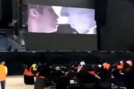 ويُظهر المشهد لقطة “ساخنة” على شاشة عملاقة أمام الحضور الذين بدا أغلبهم من النساء، حينما قبّل رجل وامرأة نفسيهما بطريقةٍ حميمة.