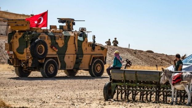 تركيا تقول إنها دخلت بحجة مواجهة خطر وجود القوات الكردية على حدودها وبهدف إنشاء منطقة آمنة بعمق 35 كيلومتراً مربعاً لكي يقطن فيها اللاجئون السوريون الذين يعيشون في تركيا حالياً وأصبحوا يشكلون عبئاً على أردوغان وعلى تركيا كما تدّعي سلطات هذه البلاد.