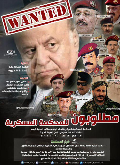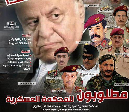 صنعاء تبدأ بأول محاكمة عسكرية علنية لهادي والأحمر وتسعة قادة عسكريين