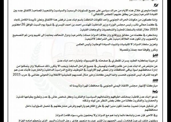 وأضاف أنه “كمكون من مكونات الحراك الجنوبي وأحد المكونات الناطقة باسم أبناء عدن نرفض هذا الاتفاق ونعلن تأييدنا الكامل لما جاء في كلمة وزير الداخلية المهندس احمد بن احمد الميسري في شبوة، وماذكره في كلمته من حقائق ووقائع وان علاقة الدولة ممثلة بالشرعية ودول التحالف بحاجة الى تقييم ومن ثم التصحيح والتصويب وان تكون هذه العلاقة مبنية على الشراكة لا التبعية، وتعزيز سلطة الدولة لا المليشيات وتثبيت السيادة الوطنية وليس العكس”.