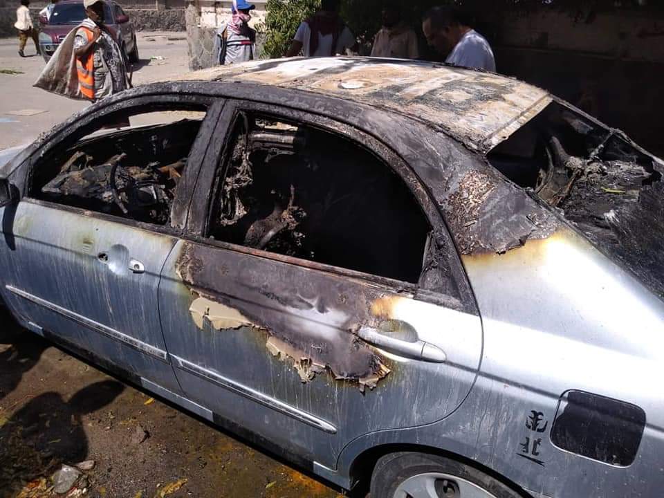 جريمة بشعة .. مقتل شخص برصاص مجهولين وإحراقه داخل سيارته بعدن (صور)