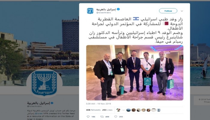 وفي هذا السياق أعلنت وزارة خارجية كيان الاحتلال، مساء الثلاثاء، أن وفداً طبياً إسرائيلياً زار “الدوحة” للمشاركة في المؤتمر الدولي حول طب الأطفال.