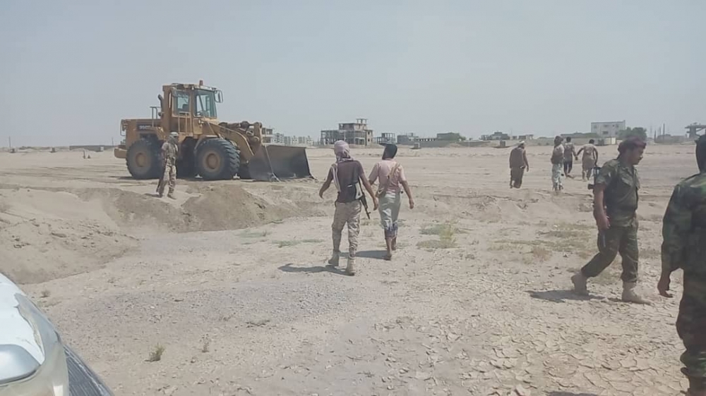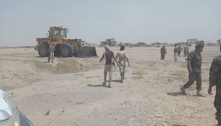 شرع نافذون تابعون لقوات المجلس الإنتقالي، في تقسيم مساحات داخل أرض مقبرة القطيع، عقب البسط عليها، في مديرية كريتر محافظة عدن.