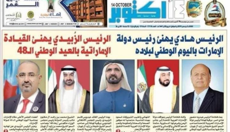 العدد الجديد من صحيفة 14 اكتوبر، التي يشرف على إصدارها المجلس الانتقالي الموالي لأبوظبي، تضمنت، بحسب ما تناقله ناشطون، تعزية واحدة للأمارات باسم هادي والزبيدي اللذين ظهرت صورهما جنب بعض وبمساحات متساوية والوان موحدة وحتى لقب واحد “الرئيسان”.