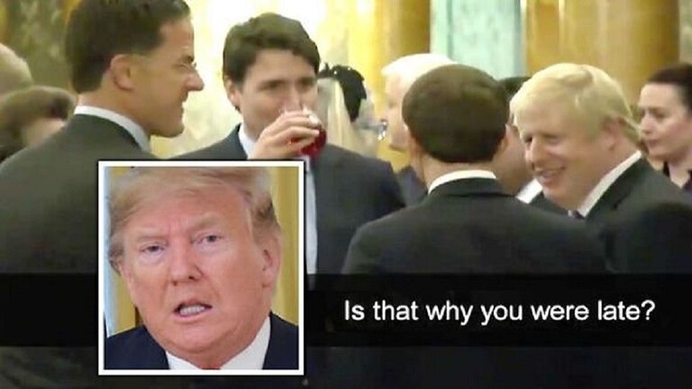 وسأل بوريس جونسون، إيمانويل ماكرون ألهذا السبب تأخرت؟، وقاطع جاستين ترودو الحوار قائلا: لقد تأخر لأن المؤتمر الصحفي في الأعلى (مع ترامب) استغرق 40 دقيقة.