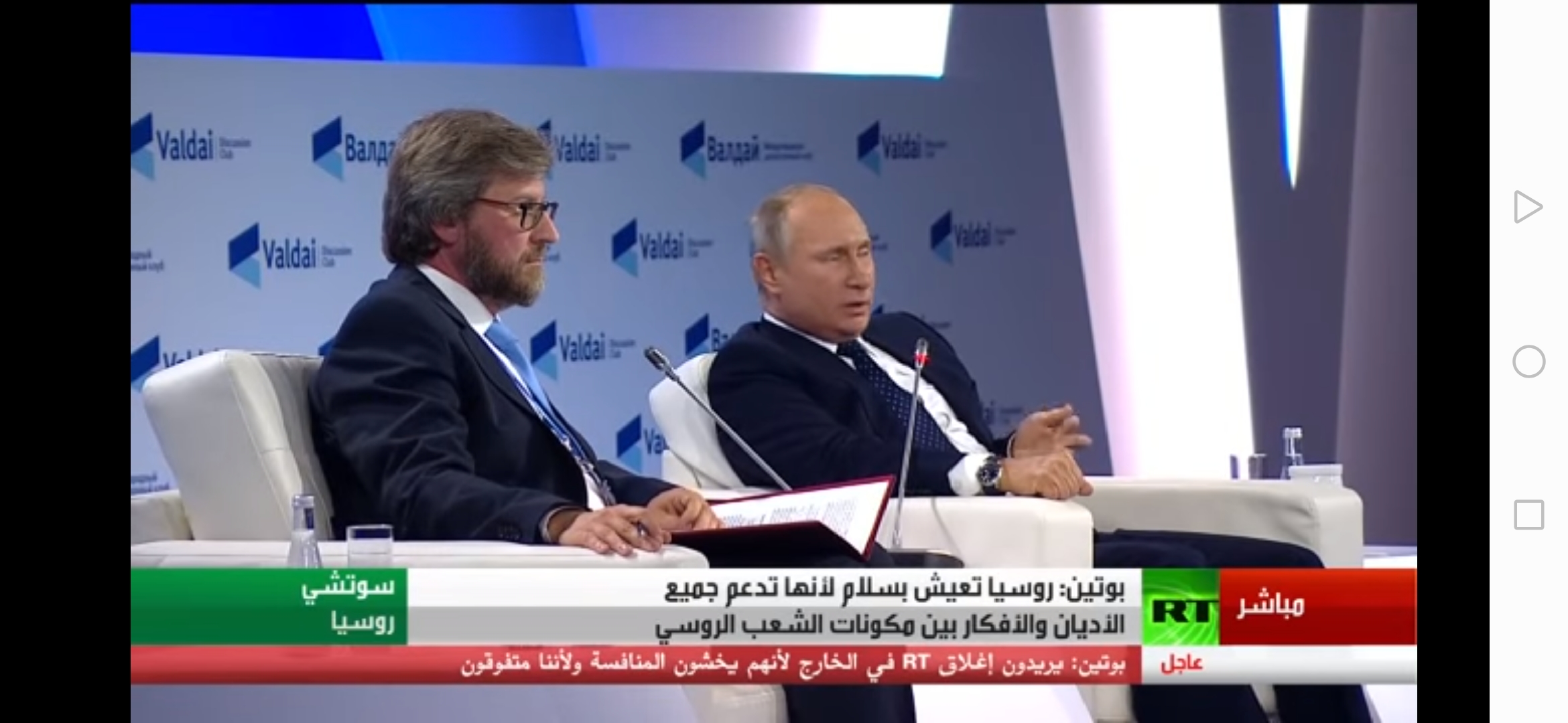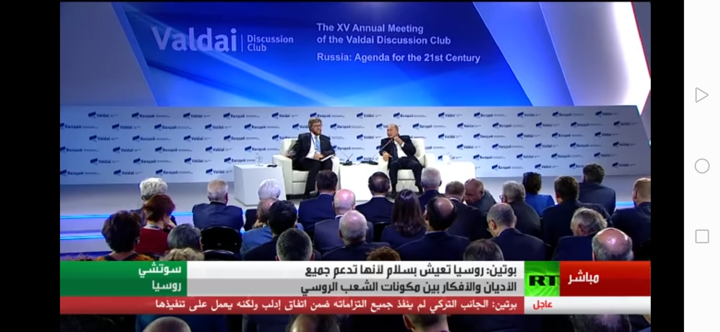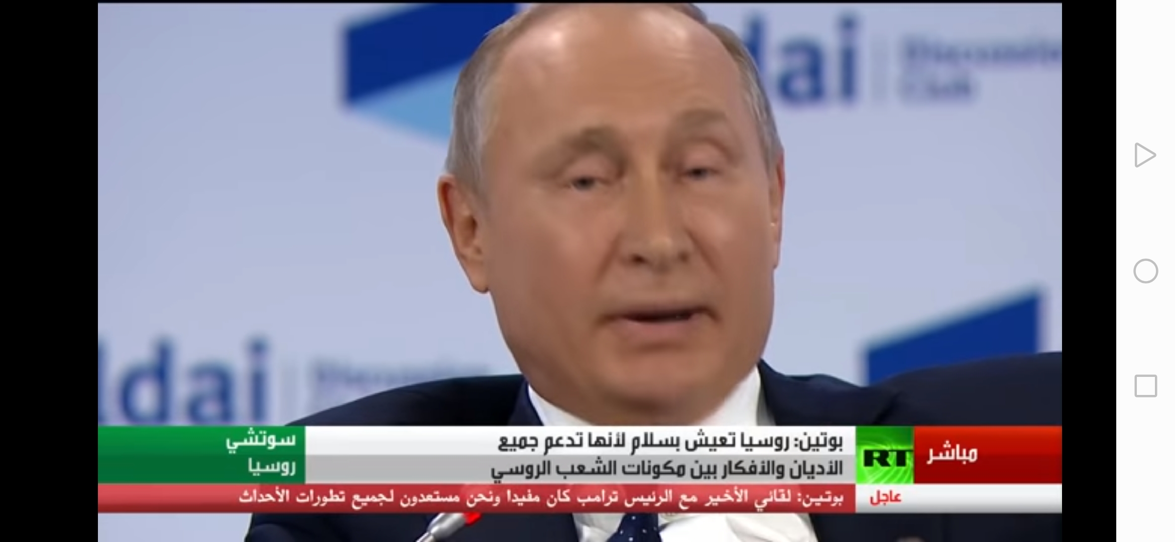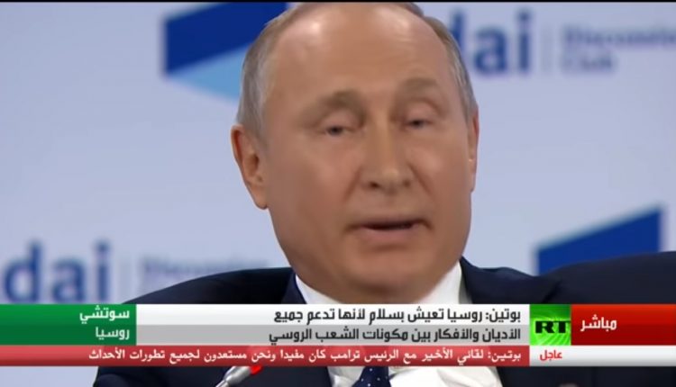 هدد الرئيس الروسي فلاديمير بوتن لأول مرة من مدينة سوتشي الروسية برد نووي على اي هجوم مماثل قد يستهدف بلاده وأكد بوتين، في مؤتمر صحفي له أمس بثته قناة RT بالعربية، أن روسيا لاتستبعد اي هجوم عليها ولكنها سترد بقوة نووية وتدمر اي معتد عليها دون تهاون، ورصد محرر مراقبون برس، جزم الرئيس الروسي بأن ضحايا اي هجوم على بلاده سيكونون شهداء في الجنة بينما المعتدى عليهم لايجد وقتا للتوبة، حسب ترجمة القناة الروسية. وأكد بوتين استعادة ٩٥٪ من الأراضي السورية.