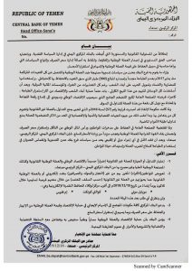 ولما تقتضيه المصلحة العامة في الحفاظ على مدخرات المواطنين ورأس المال الوطني من التآكل وإستقرار سعر الصرف ولضمان بقاء القوة الشرائية للعملة الوطنية وتجنب مزيداً من زيادة الأسعار للسلع، فإن البنك المركزي اليمني – المركز الرئيسي- صنعاء- وبعد أن فقد الأمل في أي إجراء دولي أو إقليمي يحد من سياسات فرع بنك عدن التدميرية وإنغماس العدوان في إستخدام الطباعة كسلاح لضرب العملة وإستهداف حياة المواطن.