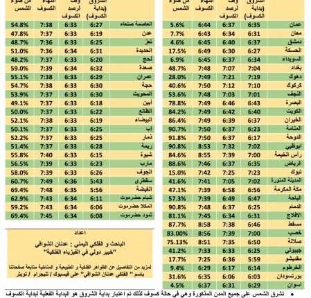 وأصدر الشوافي الجدول المرفق بمواقيت الكسوف على معظم المدن اليمنية و العربية.