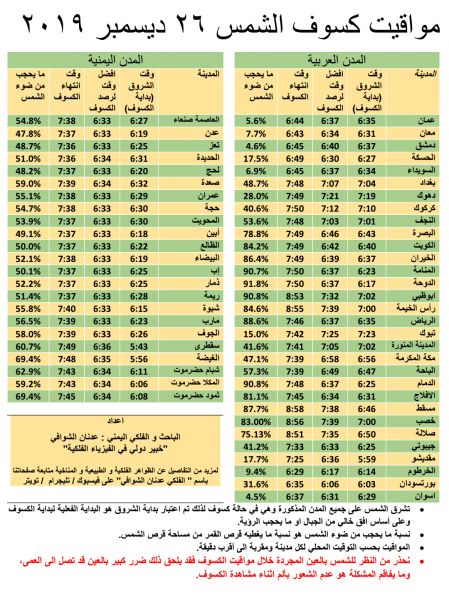 كشف الخبير الدولي في الفيزياء الفلكية، الفلكي اليمني عدنان الشوافي، عن مواقيت الكسوف للشمس، الخميس القادم 26 ديسمبر، على جميع المدن اليمنية و أهم المدن العربية.