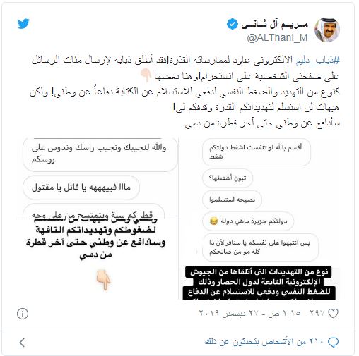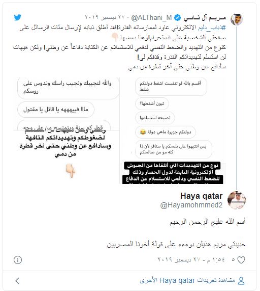 وقالت الشيخة القطرية في تعليق على التهديدات التي نشرتها بتغريدة على صفحتها بتويتر: “ذباب دليم الالكتروني عاود لممارساته القذرة! فقد أطلق ذبابه لإرسال مئات الرسائل على صفحتي الشخصية على انستجرام! وهنا بعضها.. كنوع من التهديد والضغط النفسي لدفعي للاستسلام عن الكتابة دفاعاً عن وطني! ولكن هيهات لن استسلم لتهديداتكم القذرة وقذفكم لي! سأدافع عن وطني حتى آخر قطرة من دمي”.