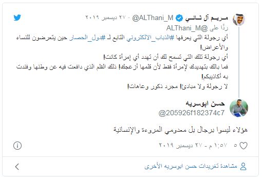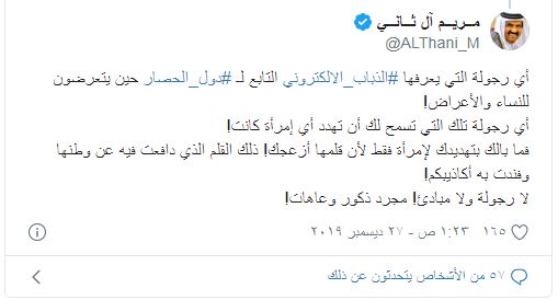 وفي تغريدة منفصلة قالت: “أي رجولة التي يعرفها الذباب الالكتروني التابع لـ دول الحصار حين يتعرضون للنساء والأعراض! أي رجولة تلك التي تسمح لك أن تهدد أي امرأة كانت! فما بالك بتهديدك لإمرأة فقط لأن قلمها أزعجك! ذلك القلم الذي دافعت فيه عن وطنها وفندت به أكاذيبكم! لا رجولة ولا مبادئ! مجرد ذكور وعاهات!”