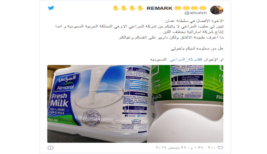 وأوضح الناشطون عبر صورا نشروها في تغريدات لاقت انتشارا وتفاعلا كبيرا ورصدتها (وطن) أن حليب المراعي السعودي الشهير الذي يملأ أسواق السلطنة لا يأتي من شركة المراعي الأم في المملكة وإنما إنتاج شركة إماراتية أو هو لبن المراعي لكنه يعبأ في دبي في ظروف غير صحية وبشكل غير آمن.