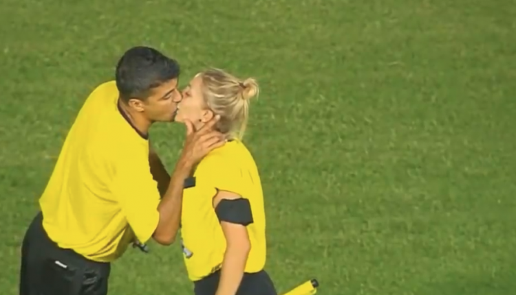 قبلة ساخنة بين حكم وزميلته قبل بداية مباراة في كرة القدم أثارت ضجة بعد إنتشار الفيديو في مواقع التواصل الإجتماعي بشكل مكثف.