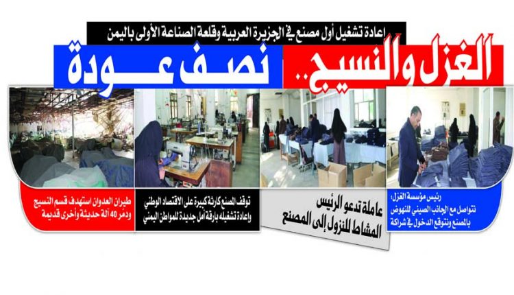صحيفة «لا» زارت مصنع الغزل والنسيج الذي يُعتبر «قلعة الصناعة الأولى في اليمن»، وطافت بين أقسامه، والتقت القائمين عليه وعدداً من العاملين فيه، مستفسرة عن أسباب توقفه قبل 15 عاماً، وكيف تعرض المصنع للدمار والنهب، وعلاقة ذلك بحرب «الحصبة» وصواريخ طيران العدوان، وماذا تعني عودة الحياة إلى هذا المصنع في ظل الحرب والحصار؟
