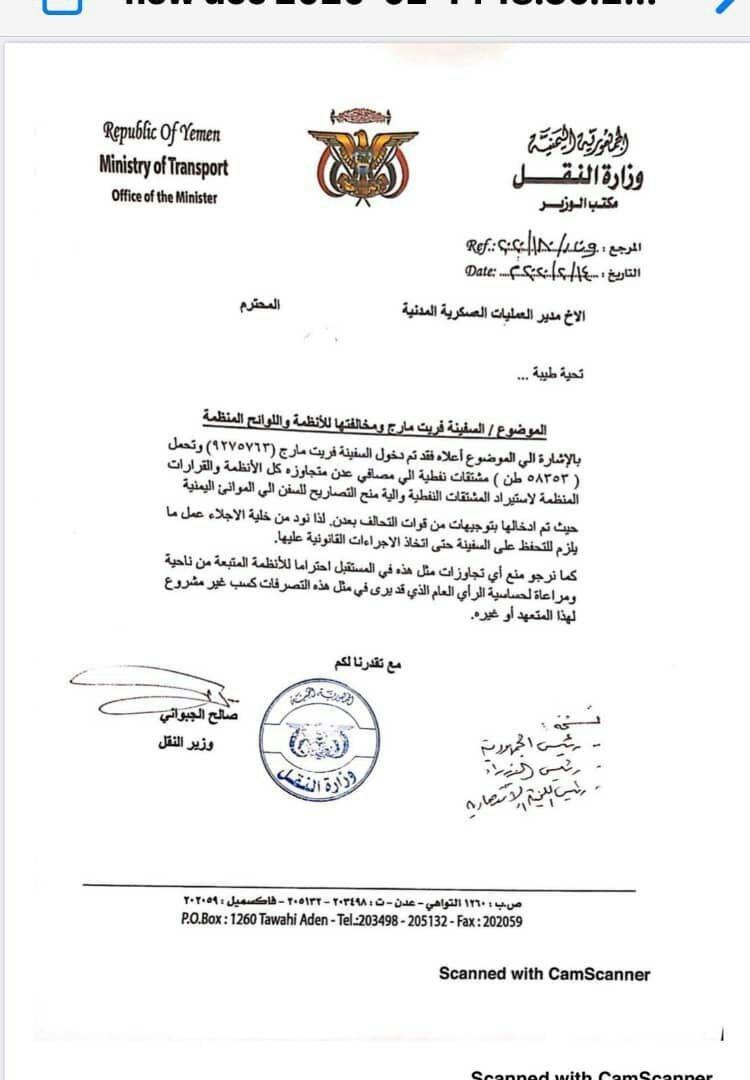 وحصلت الصحيفة أيضا على وثيقة أخرى، موقعة من وزير النقل بحكومة الخونة، المرتزق صالح الجبواني، بتأريخ أمس الأول، يخاطب فيها ما يسمى “مدير العمليات العسكرية المدنية” بأن دخول هذه السفينة والتي تحمل على متنها (٥٨٣٥٣ طنا) من المشتقات النفطية إلى مصافي عدن “يتجاوز كل الأنظمة والقرارات المنظمة لاستيراد المشتقات النفطية وآلية منح التصاريح” مطالبا بـ”التحفظ على السفينة”.