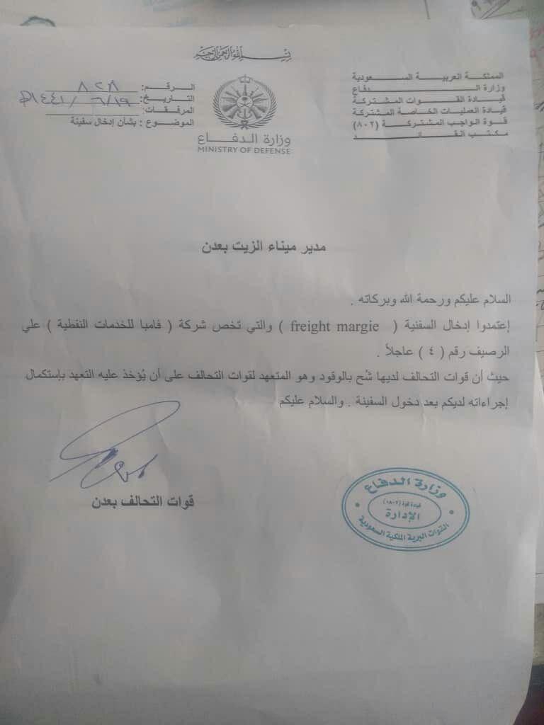 الوثائق التي حصلت عليها الصحيفة، تتضمن “توجيها” رسميا صادرا عن ما يسمى “قيادة العمليات المشتركة” بوزارة الدفاع السعودية، إلى “مدير ميناء الزيت” (التابع لمصافي عدن)، حيث يقضي التوجيه بإدخال سفينة مشتقات نفطية اسمها ( freight margie) تابعة لشركة فامبا للخدمات النفطية، إلى الميناء، بشكل “عاجل” بحجة أن “قوات التحالف لديها شح بالوقود وأن هذا هو المتعهد الوحيد لقوات التحالف”… “على ان يستكمل الإجراءات بعد دخول السفينة”.