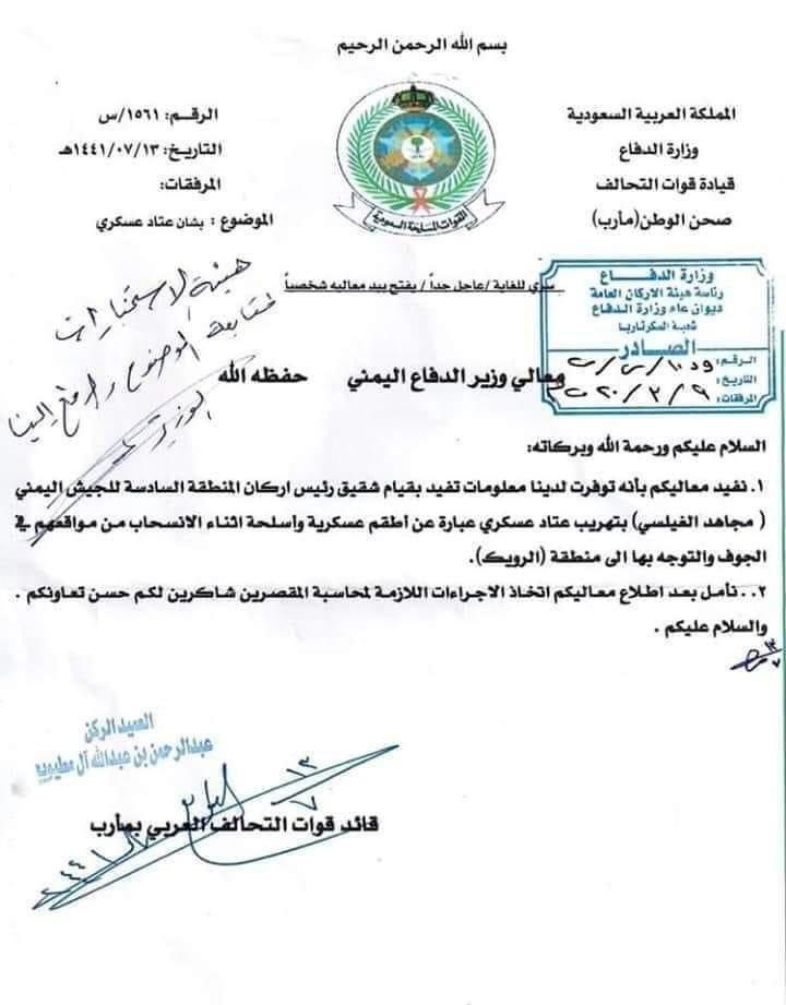 وصلت إلى مكتب وزير الدفاع بحكومة الشرعية في محافظة مأرب برقية عسكرية (سرية جداً ومستعجلة) طلب فيها قائد قوات التحالف في مأرب عبدالرحمن بن عبدالله محاسبة شقيق رئيس أركان المنطقة العسكرية السادسة (مجاهد الغليسي) بسبب قيامه بنهب عتاد عسكري والانسحاب من المواقع التابع لهم في الجوف.