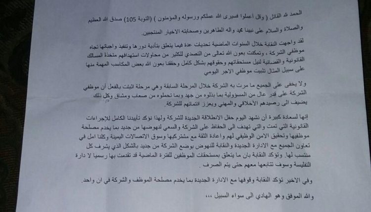 وأشارت في بيان صادر عنها، حصل “متابعات” على نسخة منه، الخميس، بمناسبة عودة الشركة للعمل بصنعاء، إلى أن النقابة واجهت خلال السنوات الماضية تحديات عدة فيما يتعلق بتأدية دورها وتنفيذ واجباتها تجاه موظفي الشركة، لافتة إلى أنها تمكنت من التصدي للكثير من محاولات استهدافهم متخذة المسالك القانونية والقضائية، “على سبيل المثال تثبيت موظفي الأجر اليومي”.