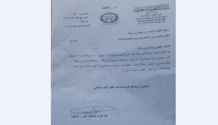 وكشفت وثيقة عن طلب قائد قوات التحالف في عدن من القائم باعمال رئيس الانتقالي احمد سعيد بن بريك , السماح بمرور 200 شخص من لحج إلى مأرب دون اسلحة .