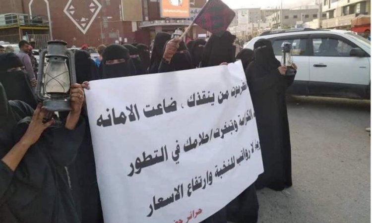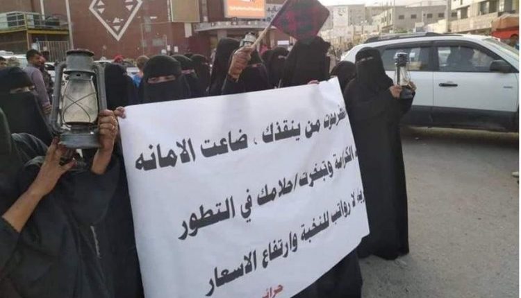 احتجاجات نسائية في المكلا على تردي الأوضاع وانقطاع الكهرباء والارتفاعات السعرية وانهيار العملة